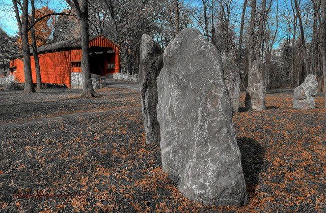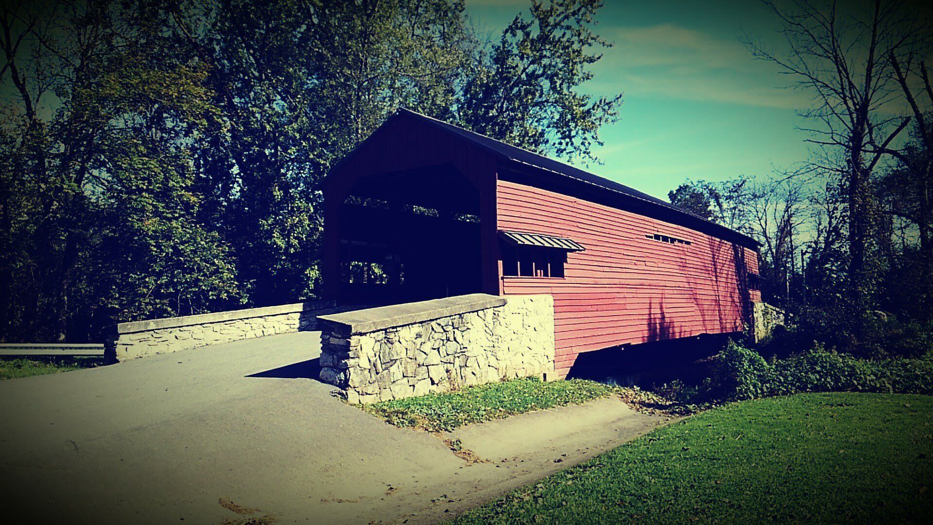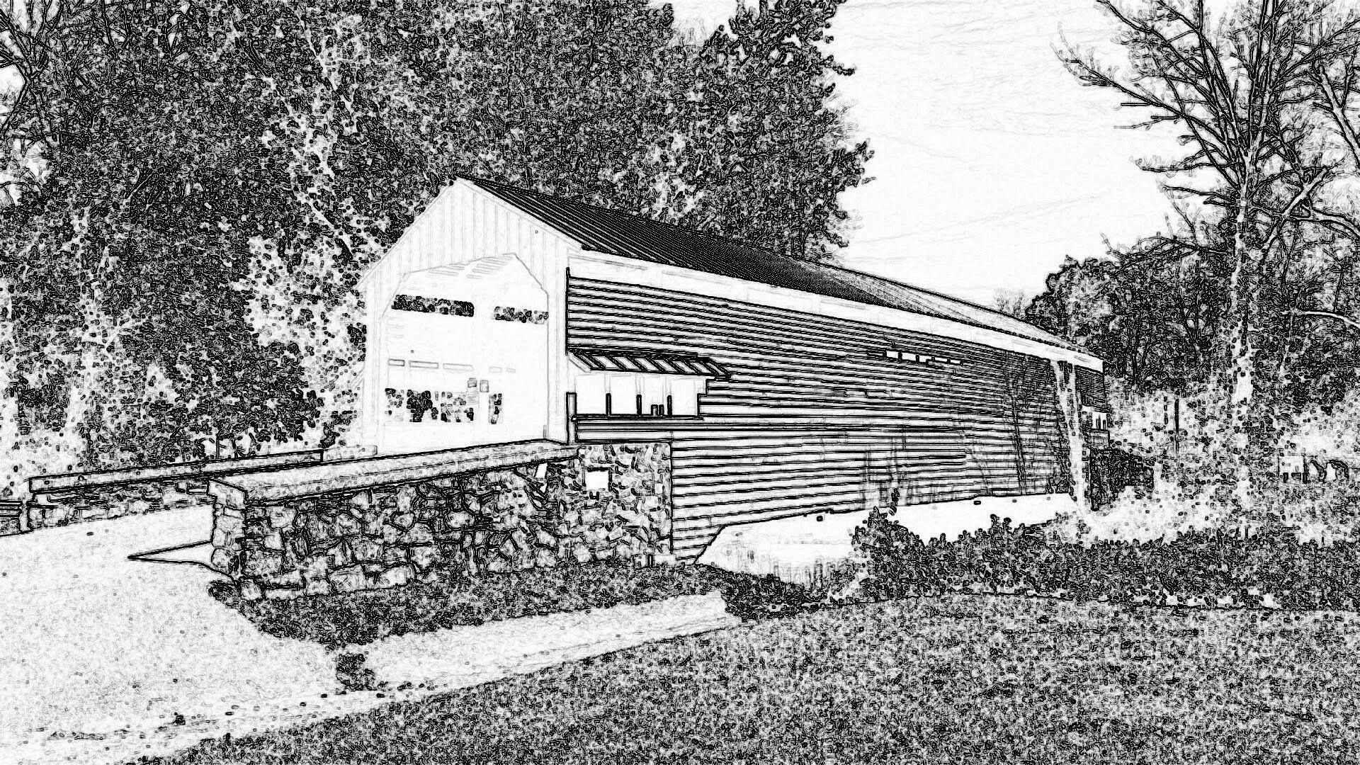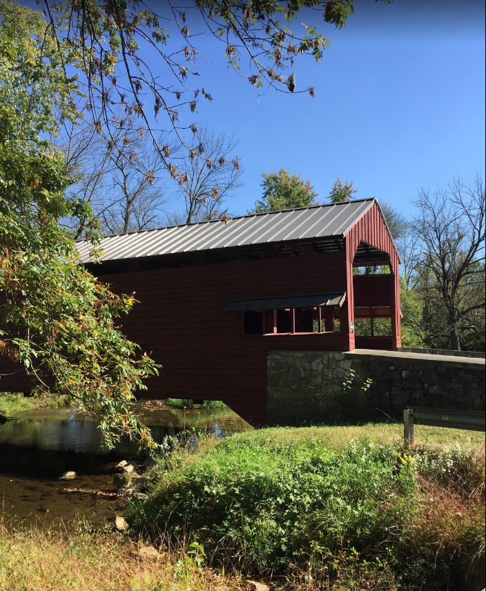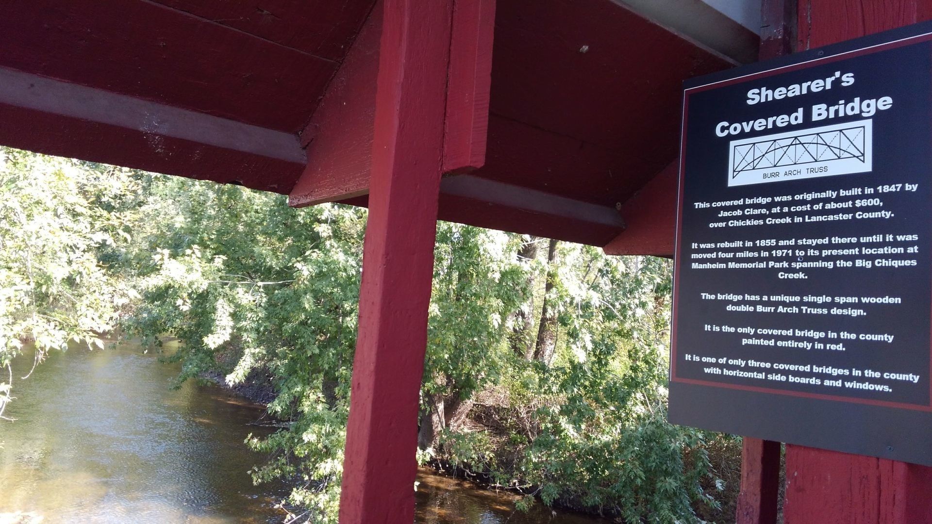 Shearer’s Covered Bridge is a covered bridge on our Manheim Farm Show grounds that spans the Big Chiques Creek in Lancaster County, Pennsylvania, United States. (Chiques Creek was known as Chickies Creek until 2002). The bridge has a single span, wooden, double Burr arch trusses design. It is the only covered bridge in the county painted entirely in red, the traditional color of Lancaster County covered bridges, on both the inside and outside including both approaches. The other all red bridge, Pool Forge Covered Bridge, is only painted on the outside. It is one of only 3 covered bridges in the county with horizontal side boards.