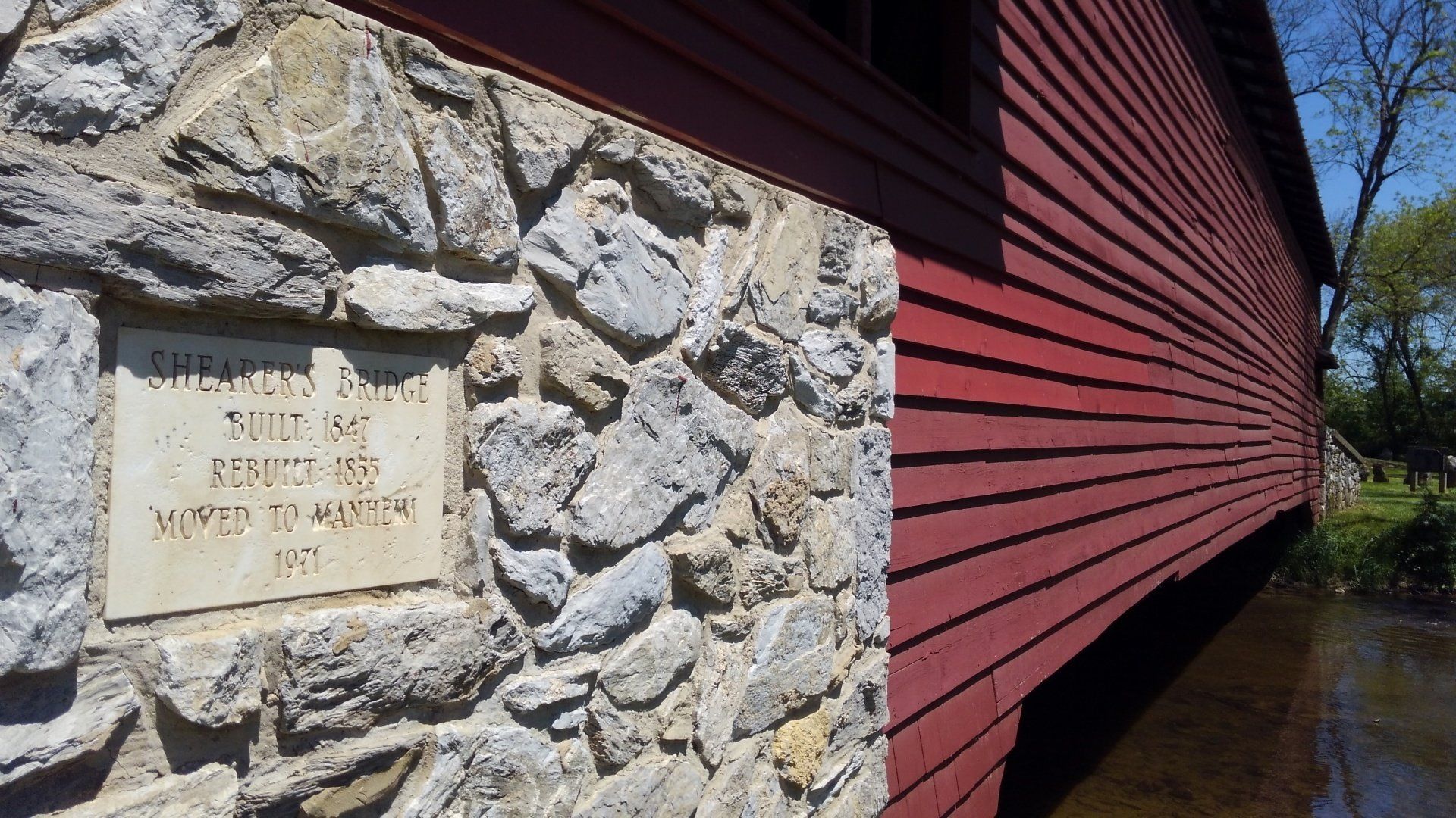 The bridge was built in 1847 by Jacob Clare. It was rebuilt in 1855 and stayed there until it was moved in 1971 to its present location in the Manheim Memorial Park.