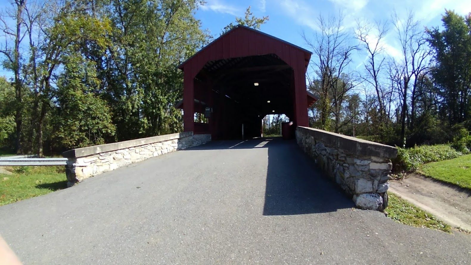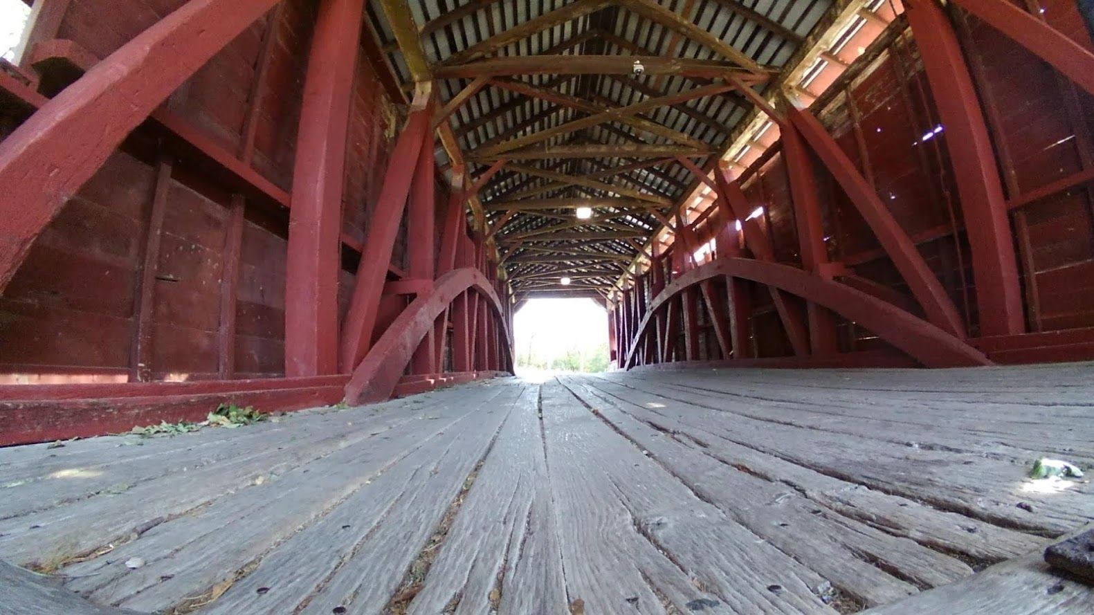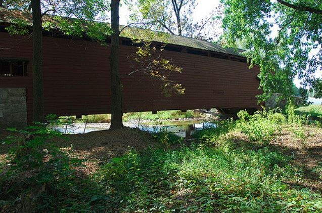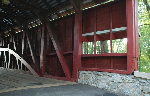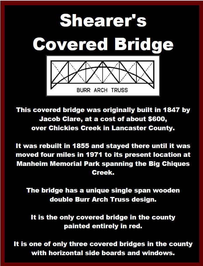 Shearer’s Covered Bridge is a covered bridge on our Manheim Farm Show grounds that spans the Big Chiques Creek in Lancaster County, Pennsylvania, United States. (Chiques Creek was known as Chickies Creek until 2002). The bridge has a single span, wooden, double Burr arch trusses design. It is the only covered bridge in the county painted entirely in red, the traditional color of Lancaster County covered bridges, on both the inside and outside including both approaches. The other all red bridge, Pool Forge Covered Bridge, is only painted on the outside. It is one of only 3 covered bridges in the county with horizontal side boards.